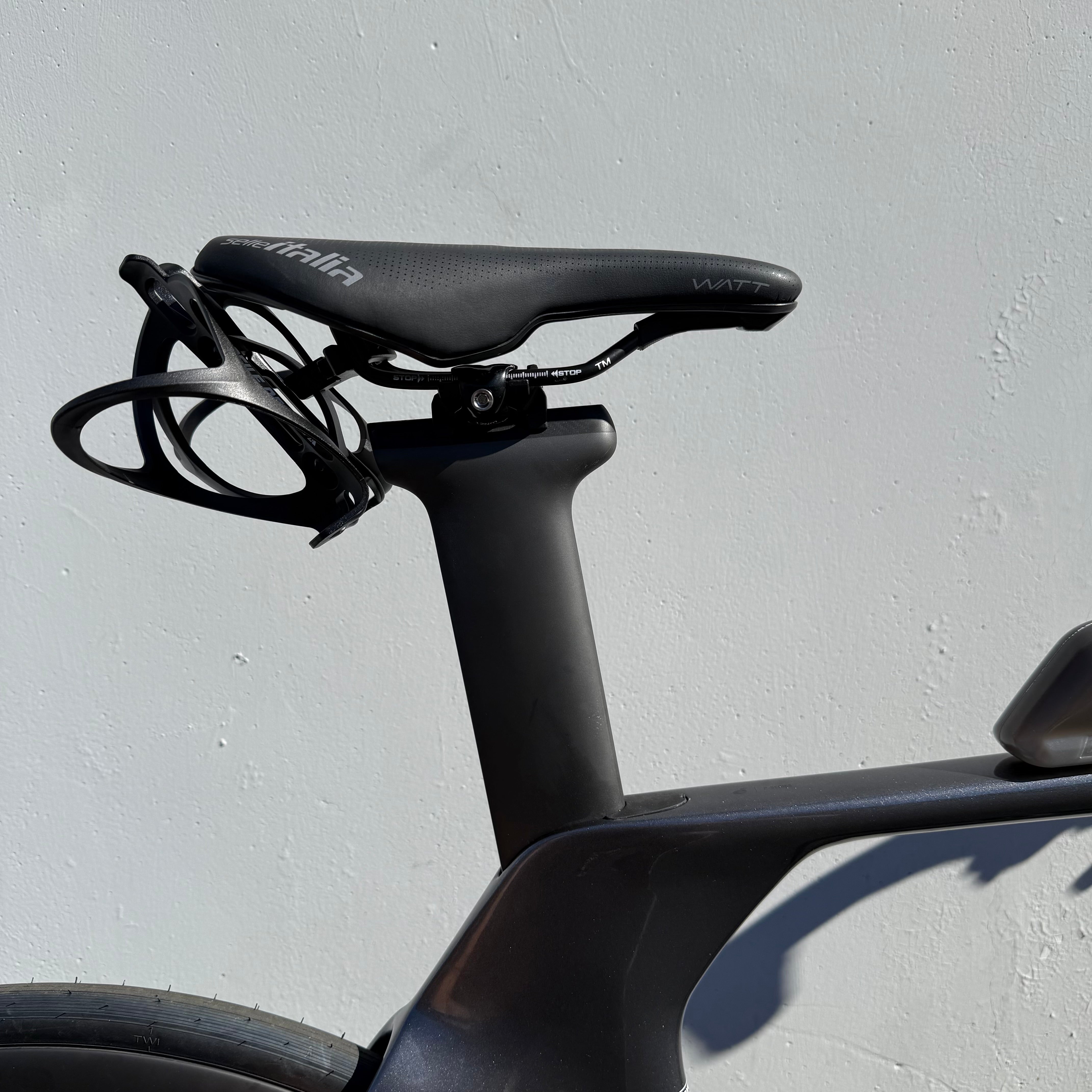 Rear mount hydration system mounts to standard 7mm saddle rails and sits flush to rear of saddle. Featuring an innovative elliptical arch clamp for tilt adjustability. Carries 1 or 2 water bottle.